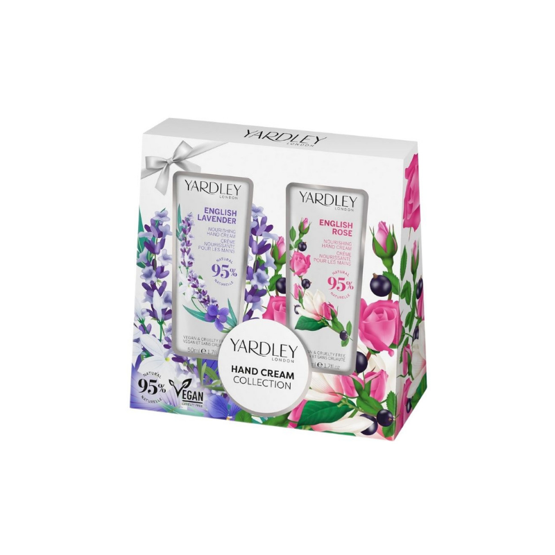 The Yardley Hand Cream Duo Gift Set includes a 50ml English Lavender Hand Cream and a 50ml English Rose Hand Cream. Enriched with nourishing ingredients and delicately fragranced with Yardley’s signature floral scents, these luxurious hand creams leave skin feeling soft, smooth, and beautifully scented — perfect for everyday pampering or as a thoughtful gift.