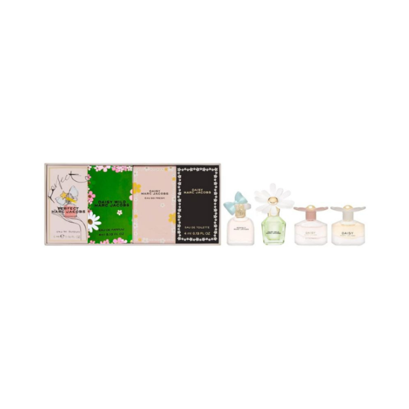 Giftset includes: 4ml Eau So Fresh Eau de Toilette Spray, 4ml Daisy Eau de Toilette Spray, 5ml Perfect Eau de Parfum Spray, 4ml Wild Eau de Parfum Spray.