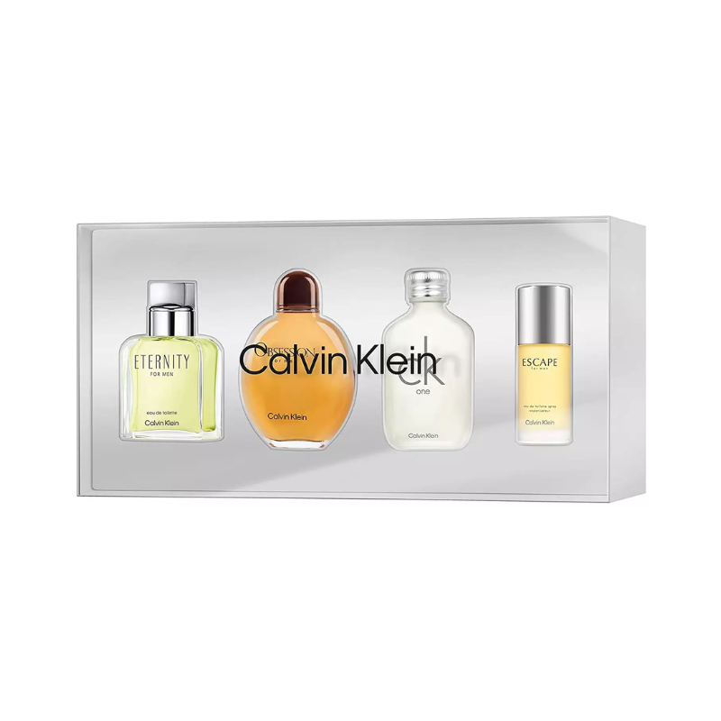 Giftset includes: 5ml Eternity Eau de Toilette Spray, 5ml Obsession Eau de Toilette Spray, 5ml One Eau de Toilette Spray, 5ml Escape Eau de Toilette Spray.