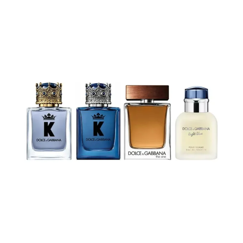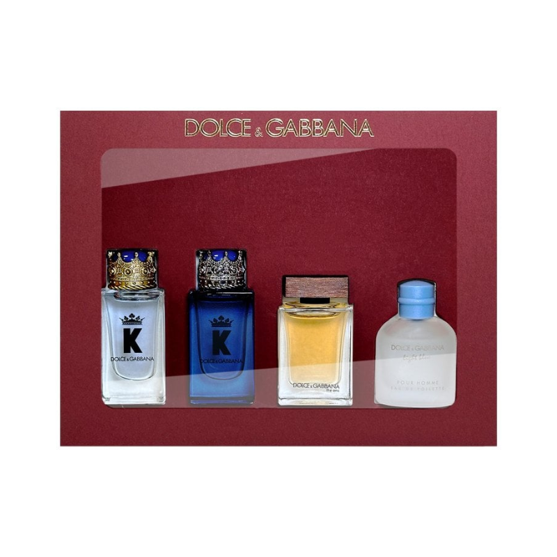 Giftset includes: 5ml K Eau de Parfum Spray, 5ml  K Eau de Toilette Spray, 4.5ml Light Blue Eau de Toilette Spray, 5ml The One Eau de Toilette Spray.